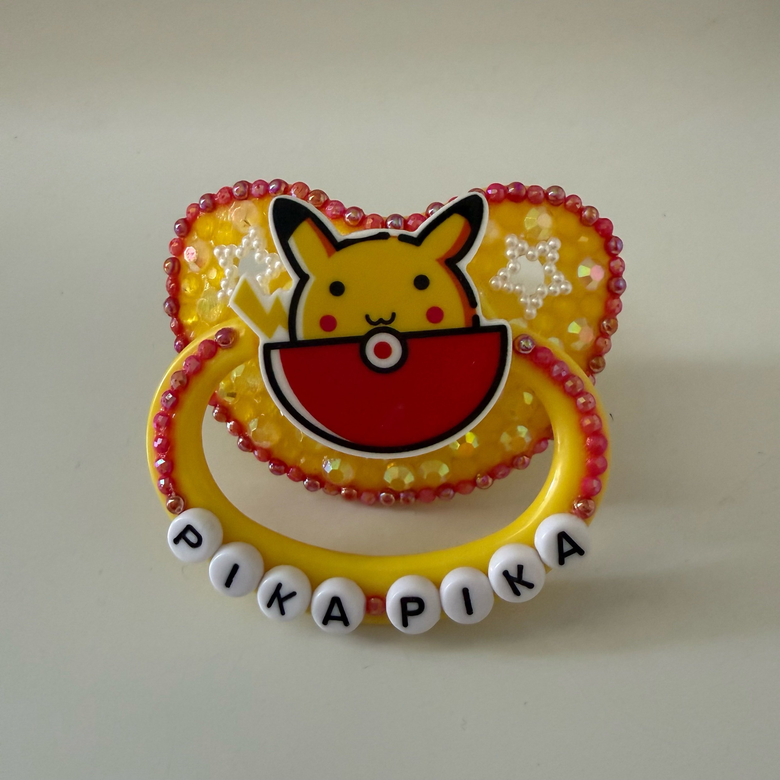Don’t forget your paci, little one! Each beautiful deco pacifier is wholly handmade, utilising a variety of deco materials to create a unique piece perfect for your collection, comfort and content! Made on a standard adult sized shield and teat combo. Whilst the glue used is heavy duty, please be sure to handle with care, store appropriately, and wash often (teat only). As the item is handmade, and glue reacts differently to various storage conditions, imperfections may occur. Unless alterations to the deco are requested, which can be completed at NO additional cost (simply reach out via Instagram to discuss your own) the item sold is as appears in photograph.